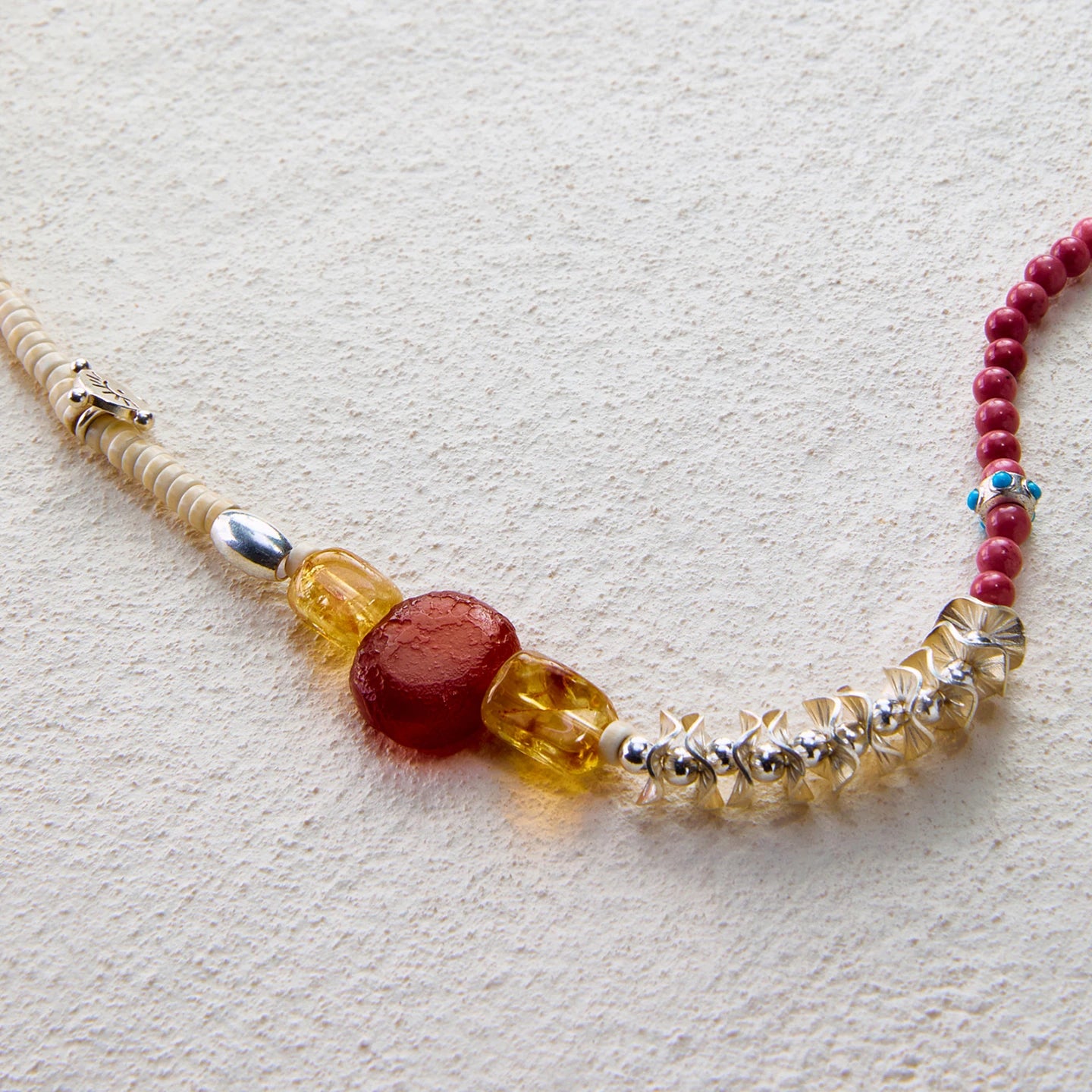 Experience the passion and balance of the EnSage 'Flame & Ember' Necklace. This piece features a striking half-and-half design, with serene **Howlite** on one side and romantic **Rhodochrosite** on the other. The center is highlighted by a warm **Citrine** and a rich **Agate**, as if capturing fire and tranquility in a single piece. Each stone is a one-of-a-kind treasure, together weaving a picture of harmony and strength.