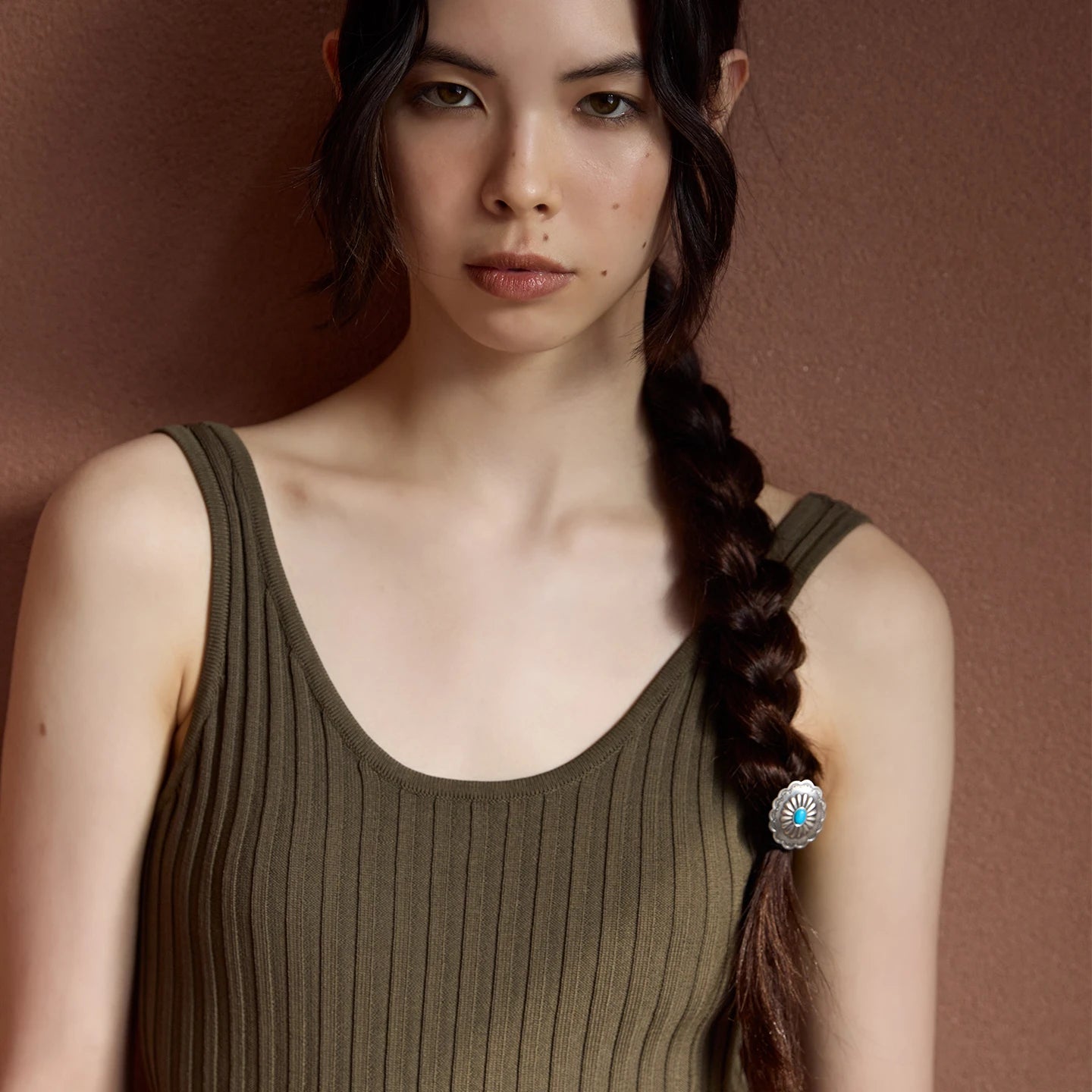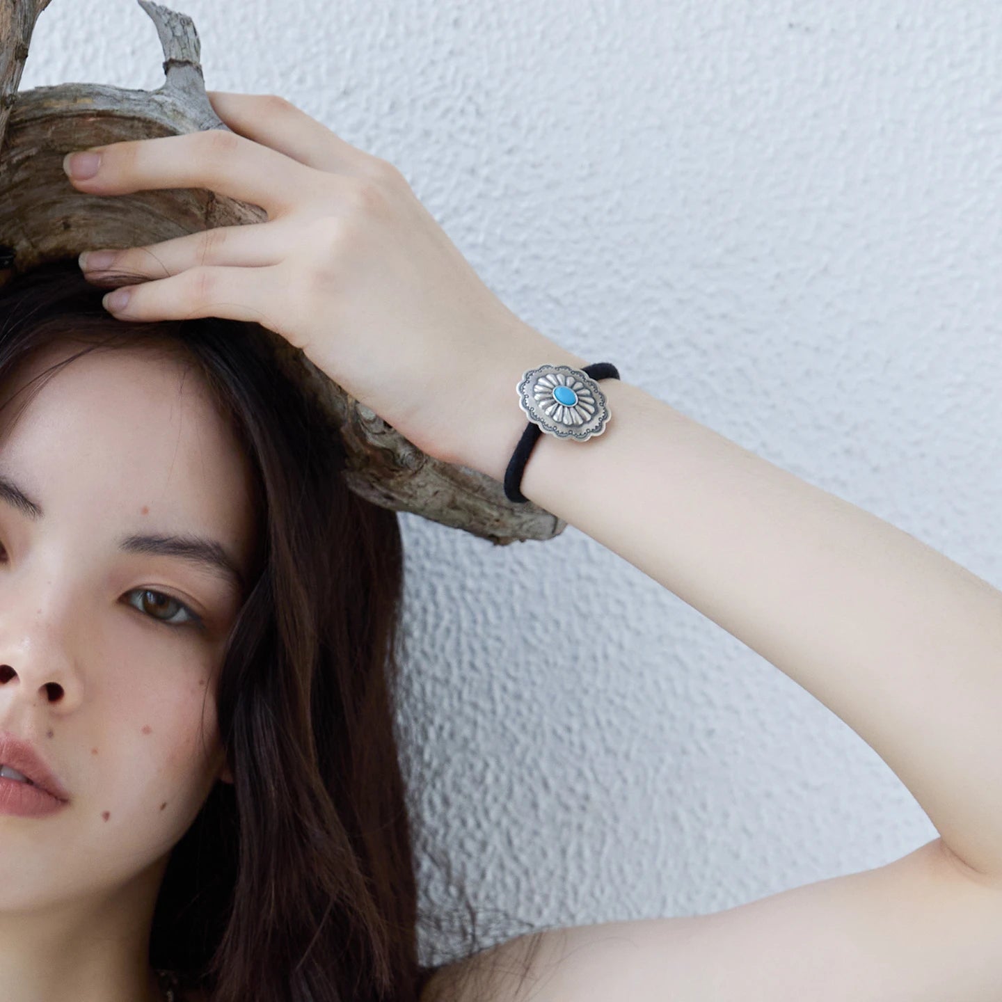 Embrace the spirit of the open frontier with the EnSage 'Earth Totem' Turquoise Hair Tie. This piece centers on a classic Southwestern concho design, blending ancient tribal motifs with the protective power of turquoise. It's the perfect accessory to add a touch of unique, bohemian flair to your daily style.
